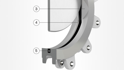 Gate guides (3) support the gate through the entire range of travel. In bottom of the guides, the relief areas (4) promote a self-cleaning, flushing action as the gate moves into the final stage of closure. The perimeter resilient seat provides tight shut-off in both directions. The seat is also reinforced with a stainless steel core (5) to enhance durability.